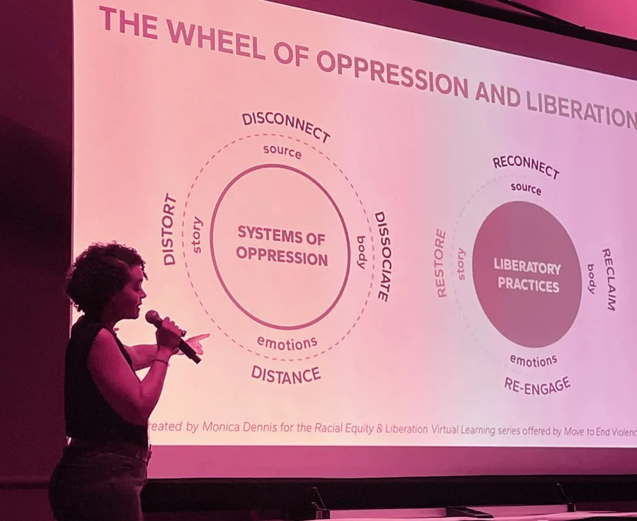 Autumn Brown presenting on The Wheel of Oppression and Liberation, a Black Feminist model for resilience developed by Monica Dennis